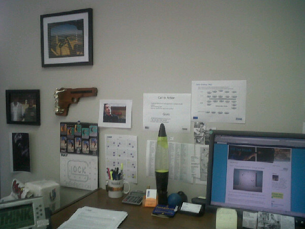 Behind me is a dry erase board and a credenza with files. And a putter and putting cup. And zombie posters behind the door. Just in case.