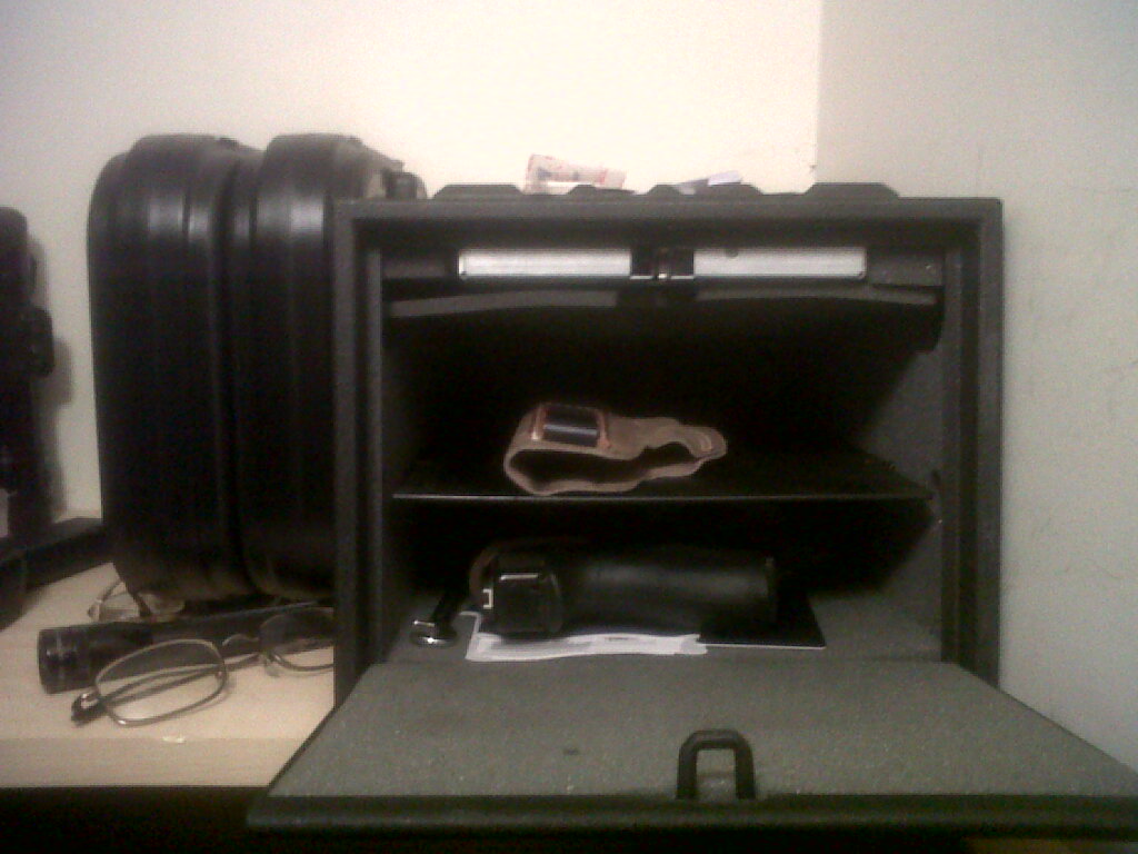 In the picture above, you can see Liberty, my Glock 19, in the bottom of the safe, along with some papers. On the top shelf is a leather IWB holster I use to house The Duke, my G21SF, when it’s in storage. At the time of this photo, The Duke was on my hip in a leather belt holster.