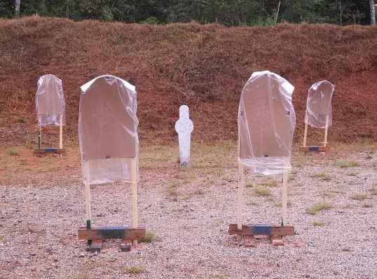 Why: I have found I can shoot 25 yard targets well, if I take my time and line up the sights correctly. Closer in, I can almost double-tap them and do well. But if I start close in and work my way out, I don’t take the discipline to line up the sights on the farthest targets, and this leads to the Dreaded Mike.