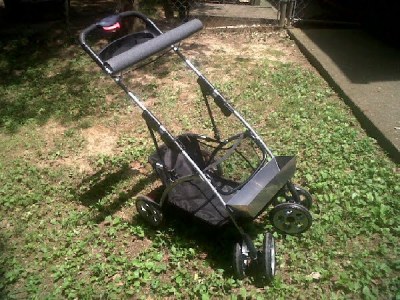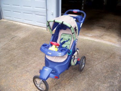 So I’ve had my eye out for a jogging stroller every time I visited the local Goodwill. The wheelbase is wider, and it’s wide overall, making it more stable, and the wheels roll better on rough ground.